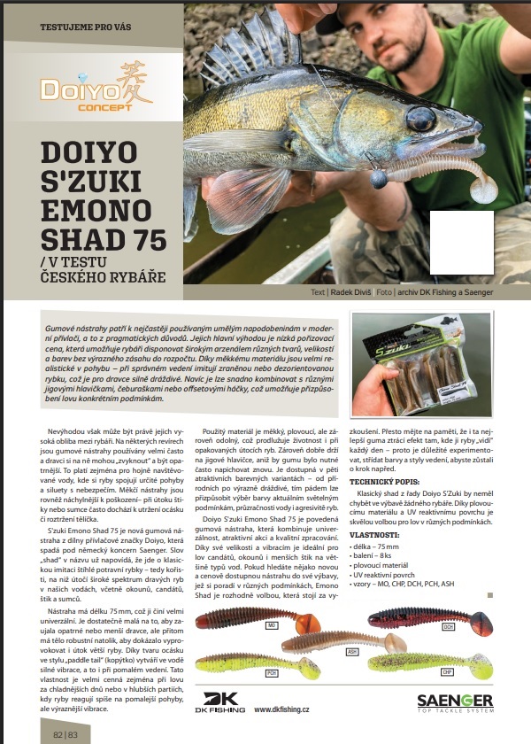 Klasický shad z řady Doiyo S'Zuki, který by neměl chybět ve výbavě žádného rybáře. Díky plovoucímu materiálu a UV reaktivnímu povrchu je skvělou volbou pro lov v různých podmínkách.